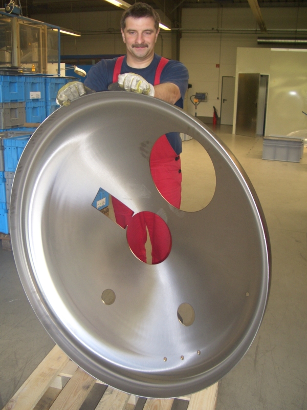 Klöpperboden geschnitten: Klöpperböden bilden den oberen und unteren Abschluss eines Rohres. Um Rohrleitungen anbinden zu können, welche in den fertigen Tanks verlaufen, werden in diese Klöpperböden entsprechende Anschlussöffnungen geschnitten. Material: 1.4301, Stärke: bis 6mm